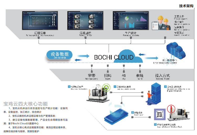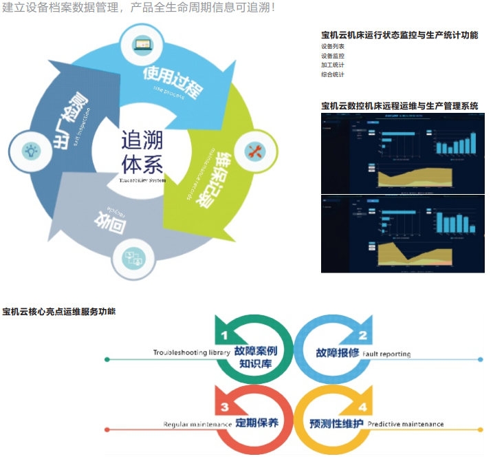 寶機(jī)云是寶雞機(jī)床數(shù)控機(jī)床全生命周期管理服務(wù)平臺(tái)。寶機(jī)云對(duì)機(jī)床數(shù)據(jù)等進(jìn)行遠(yuǎn)程采集,通過對(duì)機(jī)床大數(shù)據(jù)的分析和處理,實(shí)現(xiàn)基于機(jī)床大數(shù)據(jù)、云計(jì)算的智能化增值服務(wù)。如,面向車間管理人員的機(jī)床狀態(tài)和生產(chǎn)數(shù)據(jù)可視化,提高生產(chǎn)管理的便捷和時(shí)效;面向用戶設(shè)備的遠(yuǎn)程運(yùn)維,提高服務(wù)質(zhì)量和效率,為用戶減少停機(jī)時(shí)間,降低使用成本等等,最終實(shí)現(xiàn)企業(yè)產(chǎn)品轉(zhuǎn)型升級(jí)和價(jià)值鏈的延伸。